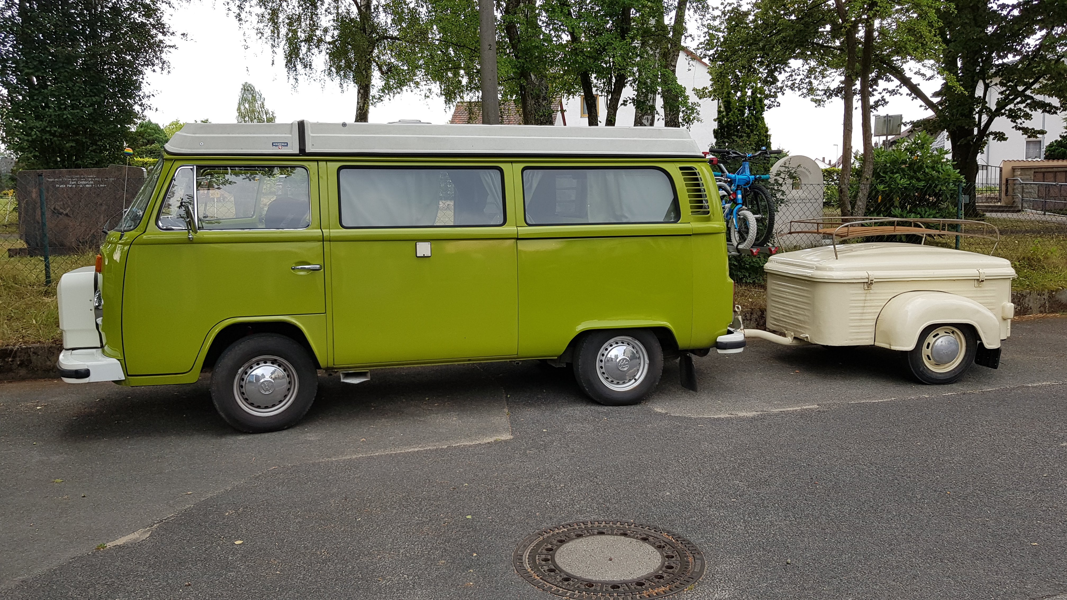 Für mich muss ein Anhänger funktional sein, deshalb sind wir mit einem Gespann unterwegs. Ohne den zusätzlichen Stauraum wirds im Bulli mit 2 Kindern viel zu eng. Gerade weil wir gern mal länger als 2 Wochen im Bulli unterwegs sind. Vom Platz her bietet der Passau KDS einiges mehr als der Heinemann. Jetzt wollen wir noch etwas nachbessern und einen Dachträger auf dem Passau montieren, um die Radl ordentlich transportieren zu können. In den Näher von Nürnberg fanden wir dieses alte Schätzchen. Jetzt müssen wir uns noch überlegen, wie am besten der Träger montiert wird, es war kein Montagematerial dabei.